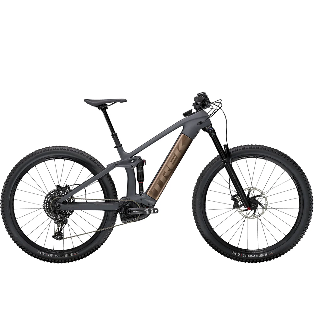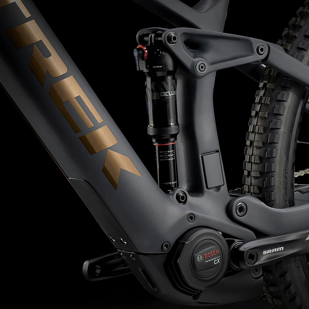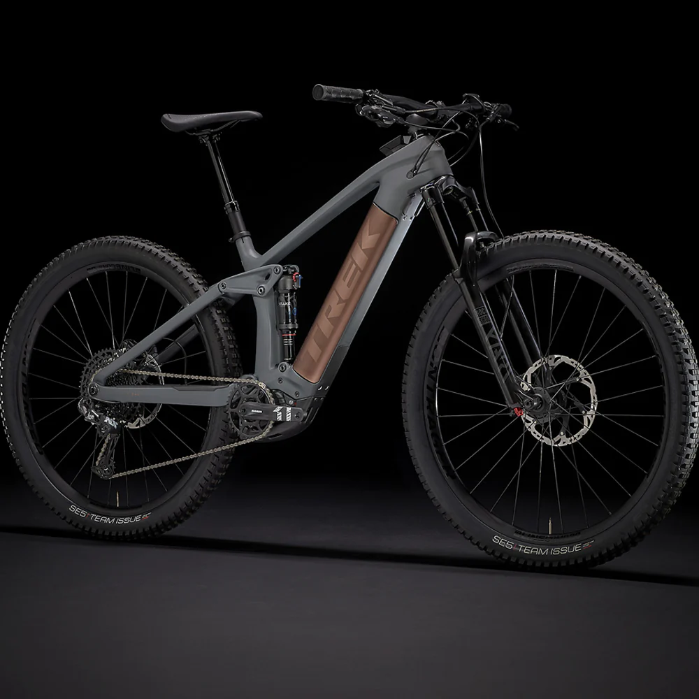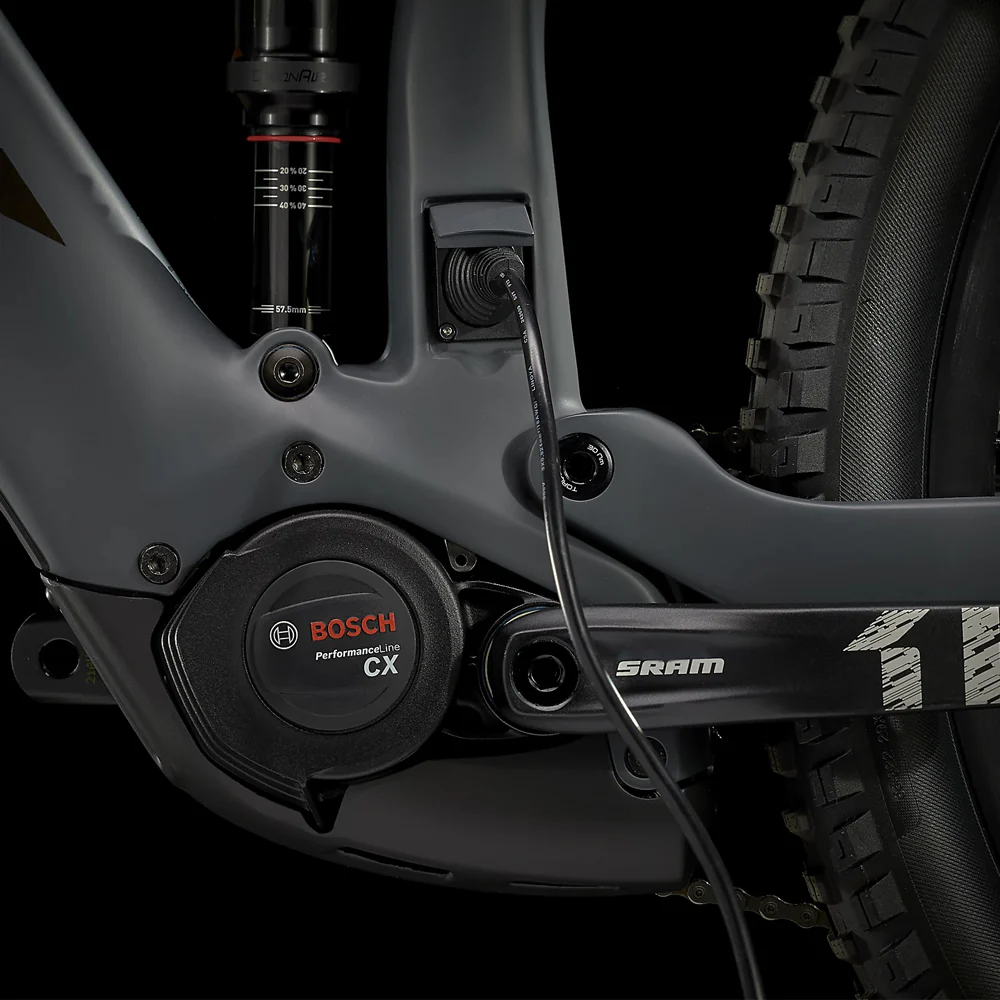 Un cuadro de carbono OCLV Mountain que incluye una batería de 625 Wh, una horquilla RockShox Yari RC de 160 mm, 150 mm de recorrido trasero con un amortiguador RockShox Deluxe Select +, un motor Bosch Performance Line CX de 250 W que asiste hasta 20 mph y un controlador Kiox. Una transmisión SRAM NX Eagle 1×12, una tija telescópica Bontrager Line, potentes frenos de 4 pistones para descensos seguros y ruedas Bontrager Line Comp 30 29er que ya están completamente listas para usar sin cámara, incluido el sellador.